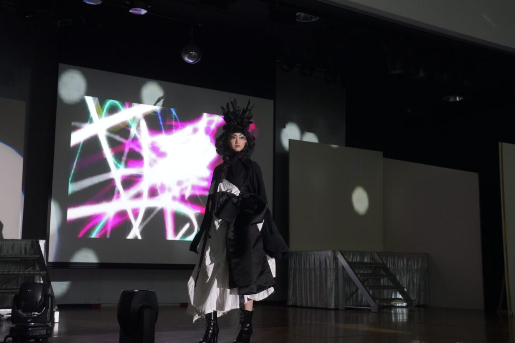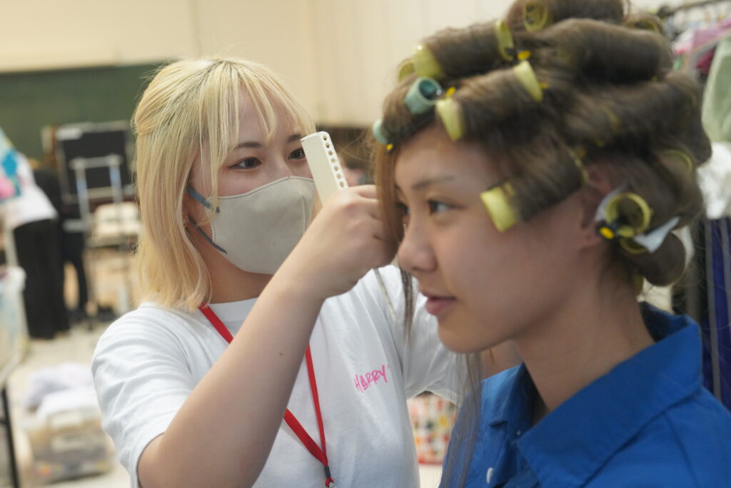 ヘアーショー前、モデルさんの仕込みもハリビ生が全力でお手伝い!プロの技術を学びます!