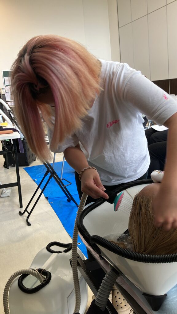 訪問美容で実際に使用するシャンプー台を使った体験授業。