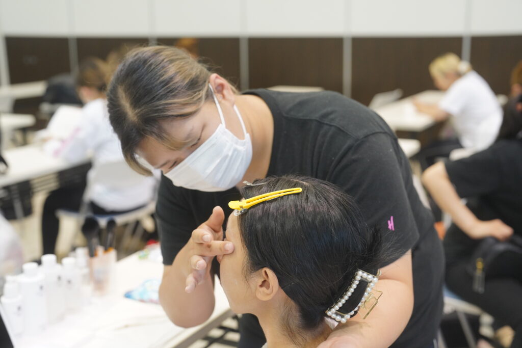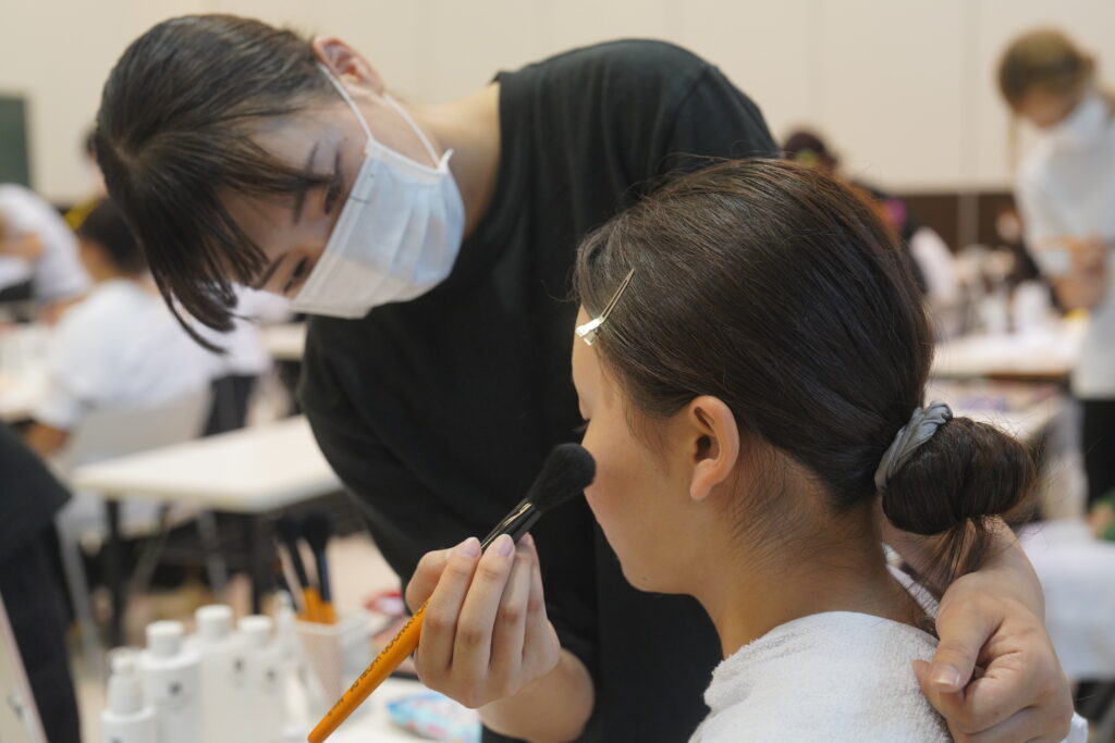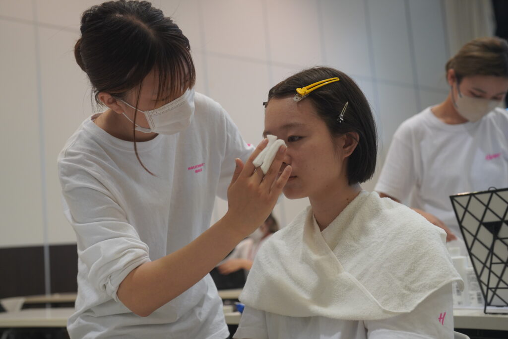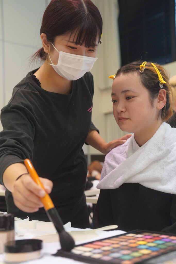 モデルとなる生徒と施術をする生徒の会話は禁止されており、「失礼いたします」「目を開けて斜め上をみてください」「チークをいれますね」などの声かけのみ許されており、静寂と緊張感の中、黙々と手順通りに取り組みます。