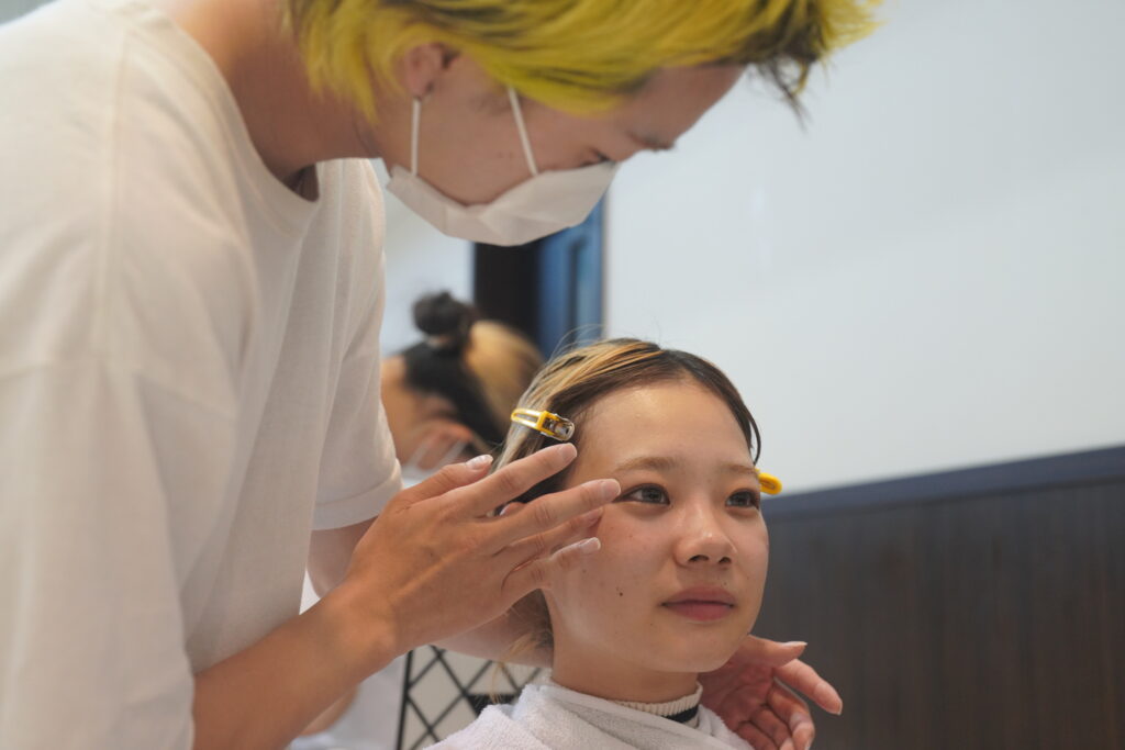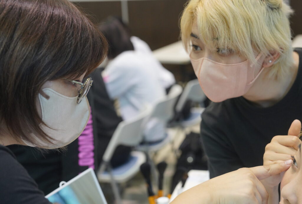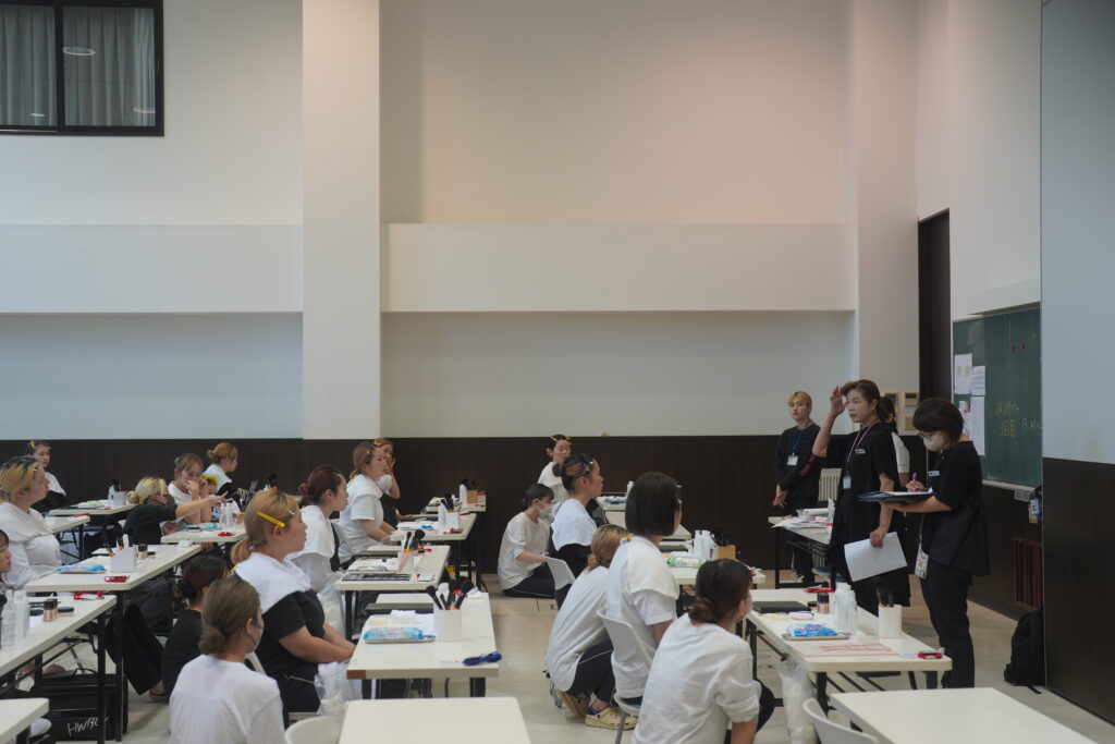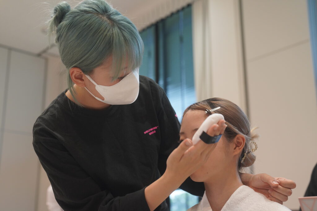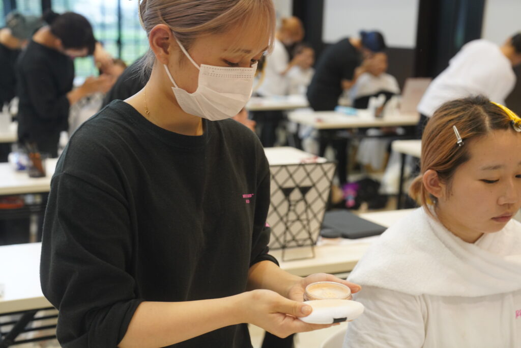 モデルとなる生徒と施術をする生徒の会話は禁止されており、「失礼いたします」「目を開けて斜め上をみてください」「チークをいれますね」などの声かけのみ許されており、静寂と緊張感の中、黙々と手順通りに取り組みます。